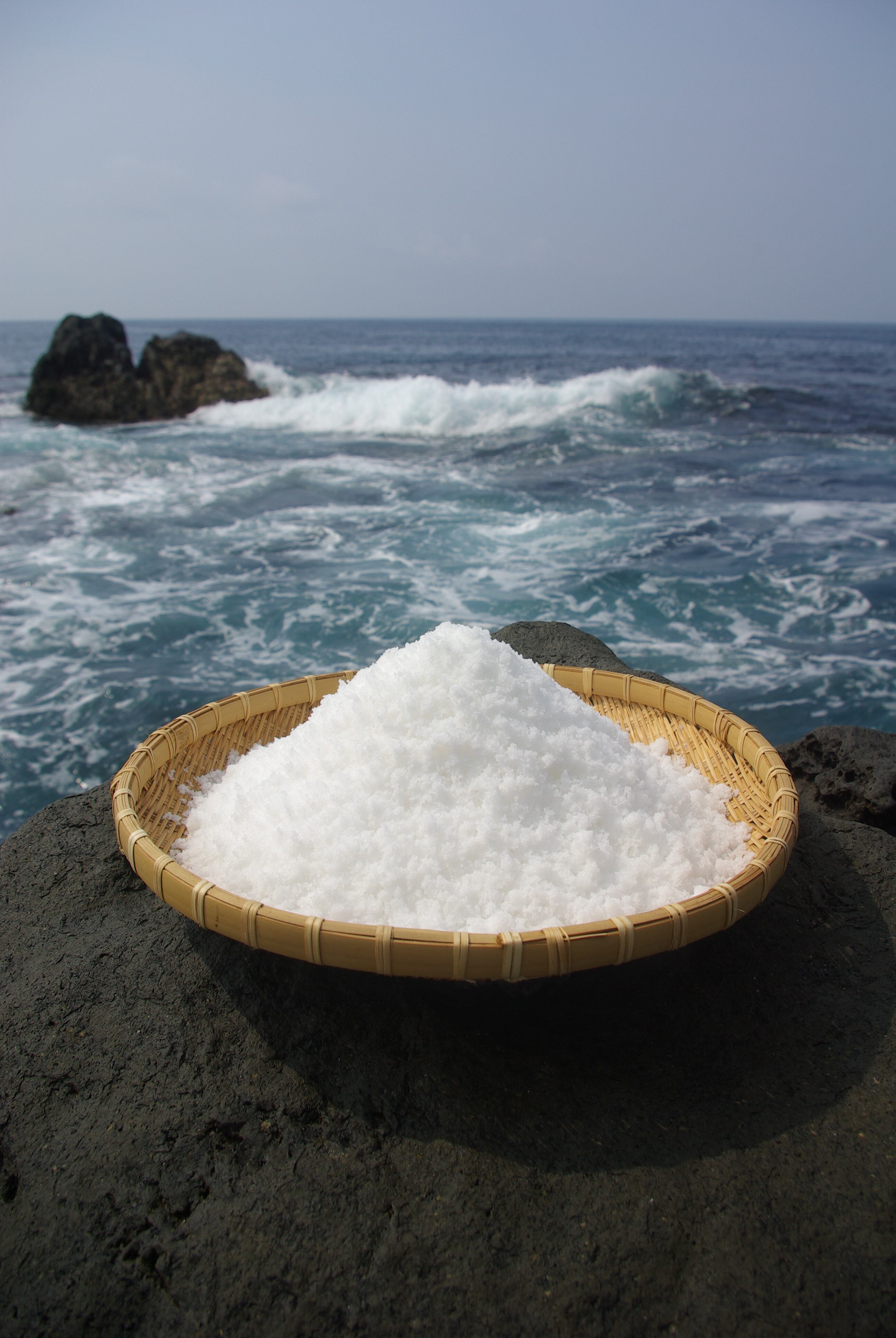 産地は、美しい自然に囲まれた離島、伊豆大島です。原料は、黒潮が運ぶ清らかな海水100%。他の原料塩などは使っていません。製法は、太陽と風と火の力を活用する日本伝統の製造法を継承しつつ、独自の工夫を加えてきました。ネット架流下式塩田で海水を濃縮し、蒸気式平釜で塩を結晶させています。