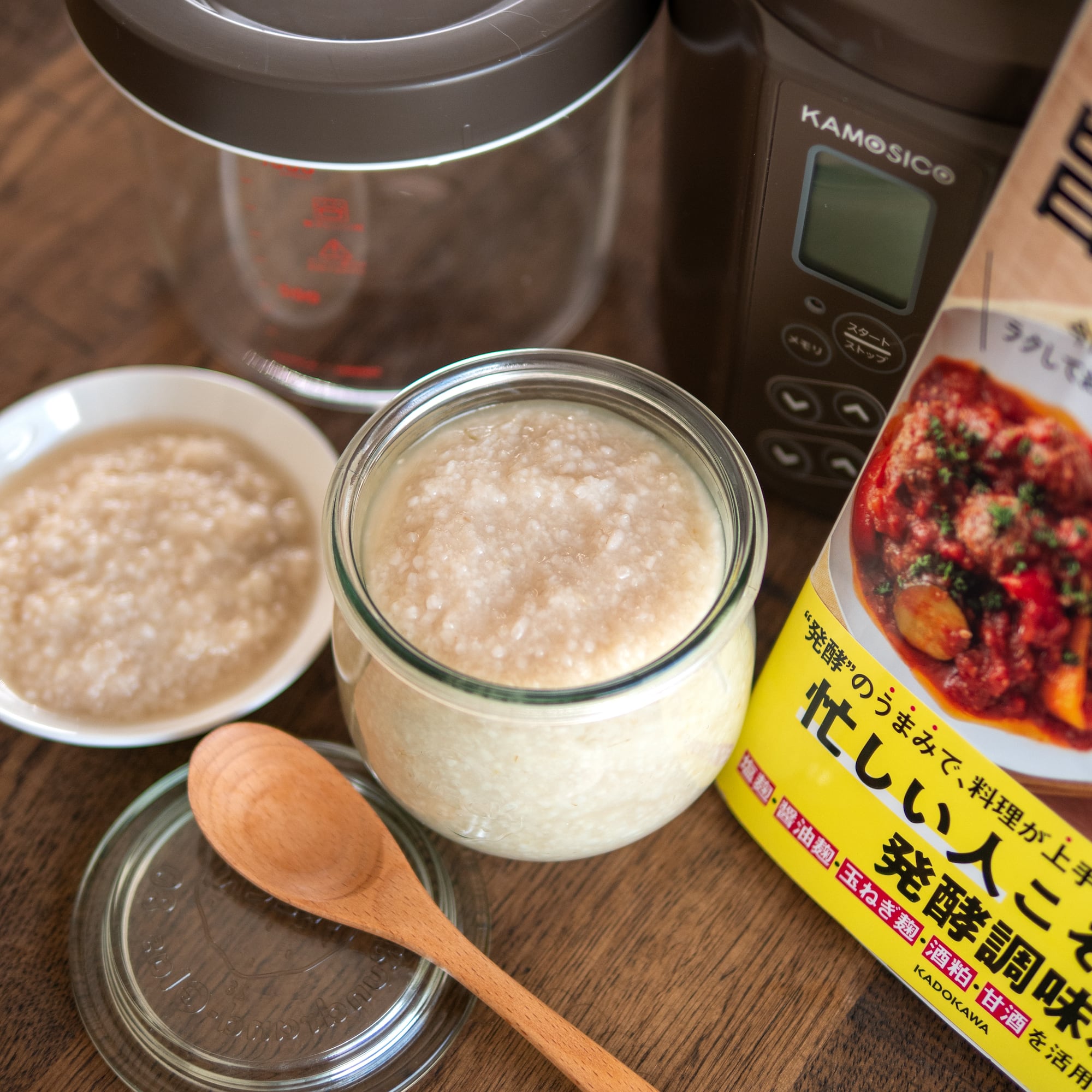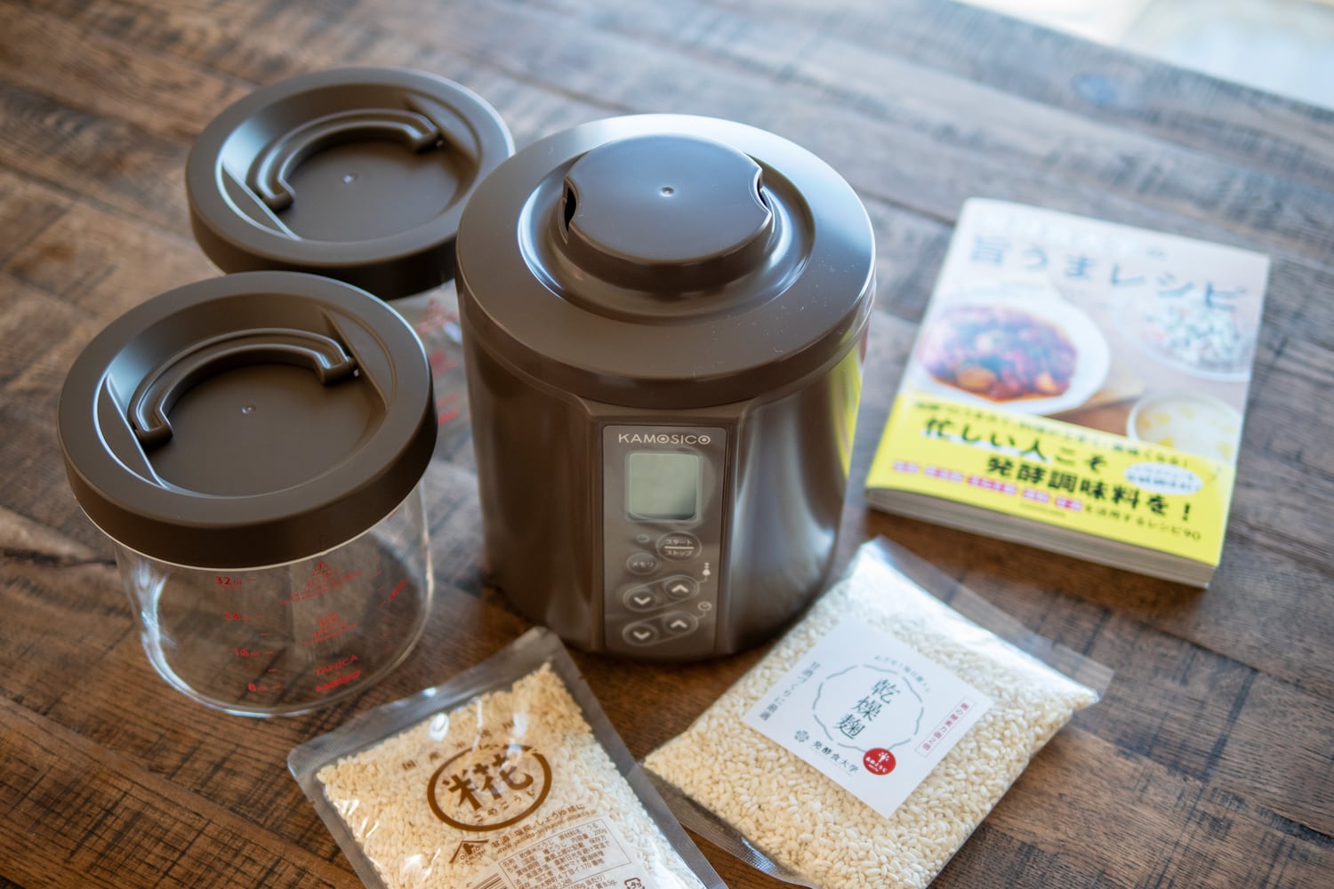 発酵調味料作りに欠かせないヨーグルトメーカー「KAMOSICO」に、初めての方でも甘くで美味しい甘酒ができる特選麹2種と、KADOKAWAから出版の人気レシピ本「発酵食大学旨うまレシピ」をセットにしました!